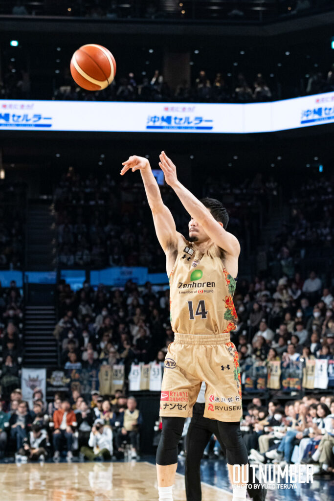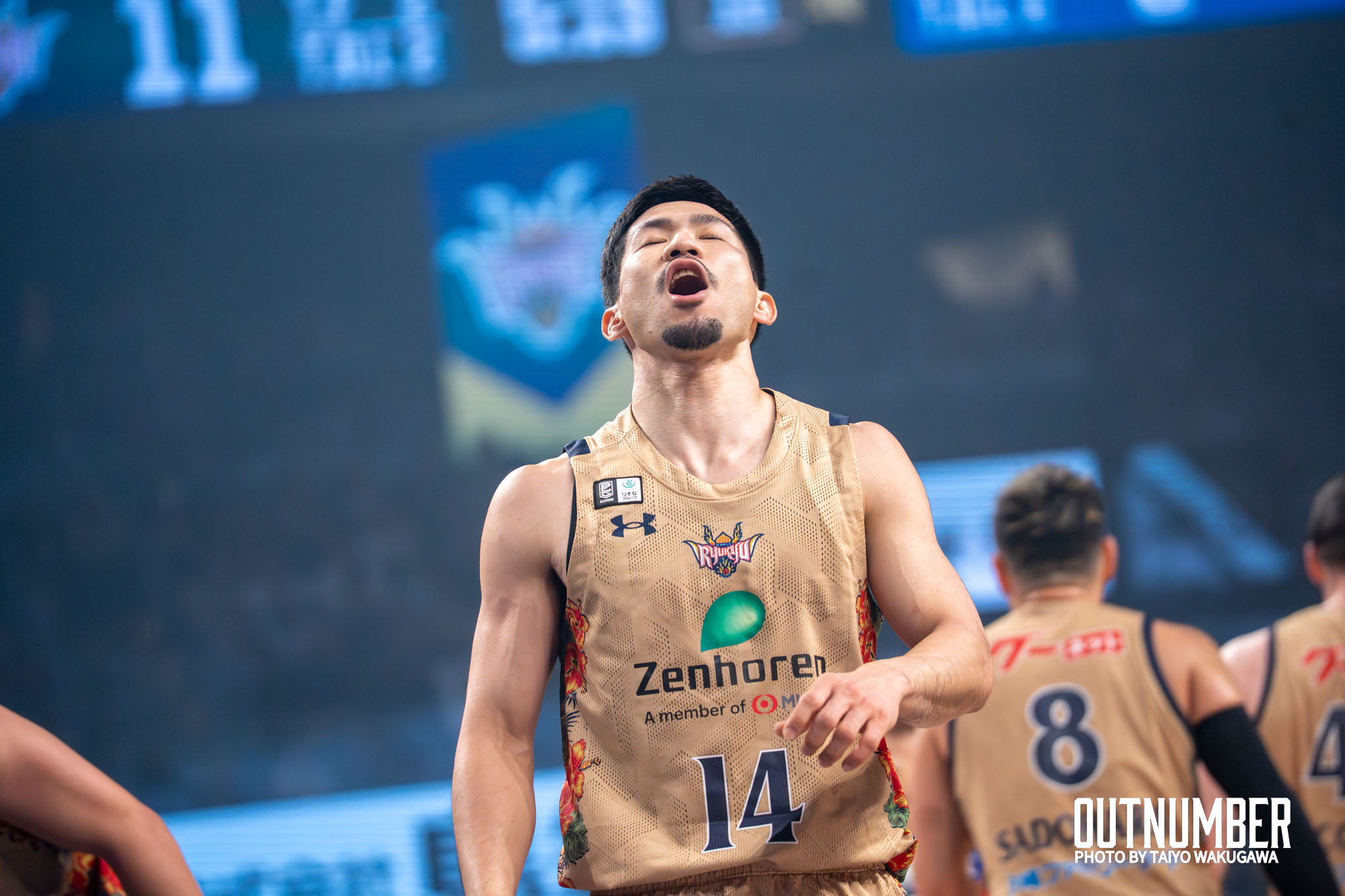 勝負の最終クォーター、試合を決定づけたのは #14 岸本隆一。このクォーターだけでさらに2本の3ポイントシュートを成功させ、不調からの完全復活をアリーナのファンに印象付けた。特に、コート中央ロゴ付近から放たれ、美しい放物線を描いた6本目の成功は、満員の観客の熱狂を最高潮に達させ、「ミスターキングス」の真骨頂を見せつけるプレーだった。