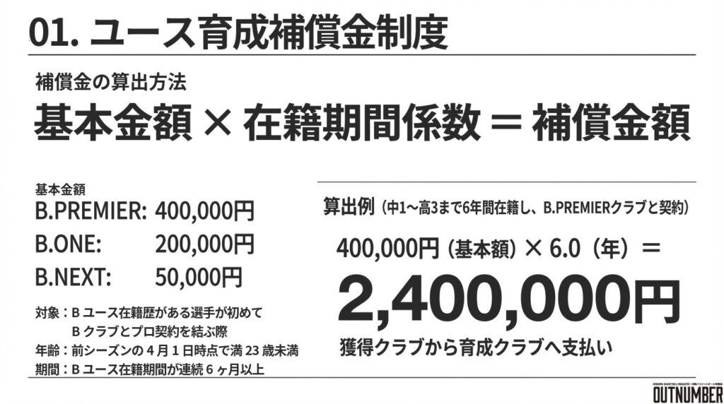 計算例: 中学1年生から高校3年生までの6年間、クラブAのユースに所属した選手が、B.PREMIERのクラブBとプロ契約した場合、計算式は「400,000円(B.PREMIERの基本金額) × 6.0(在籍期間係数) = 2,400,000円」となる。したがって、クラブBはクラブAに240万円の補償金を支払う。