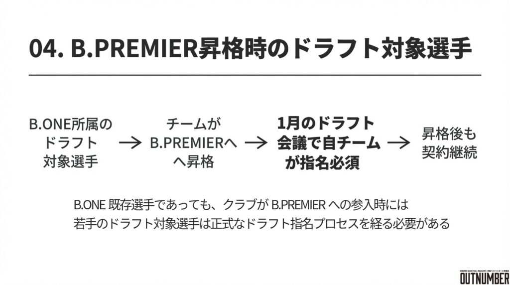 B.ONEからB.PREMIERへの昇格が決定したクラブに所属するドラフト対象選手(卒業後3年以下など)は、クラブがB.PREMIER昇格時にそのままクラブと契約継続してB.PREMIER選手となるわけではない。選手自身がB.PREMIERへの参入意思がある場合は、昇格前シーズン1月に開催するドラフトにエントリーしなければいけない。