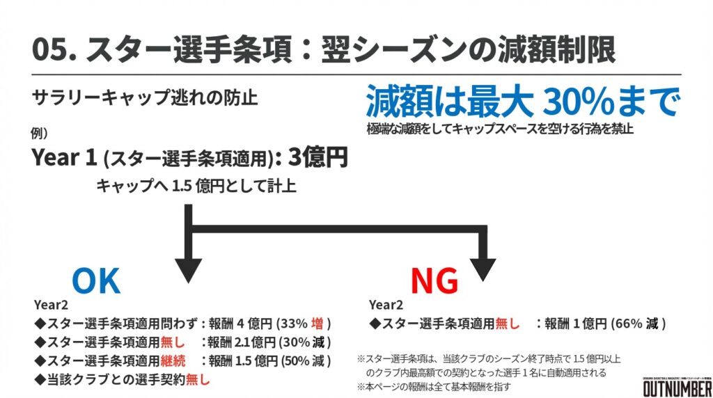 例えば、基本報酬3億円でスター選手条項が適用されていた選手は、翌シーズンに同条項を適用せずに2.1億円(30%減)で再契約することは許される。しかし、クラブがその選手の基本報酬を1億円(66%減)まで引き下げることは、サラリーキャップ制度の意図を歪める行為と見なされ、認められない。