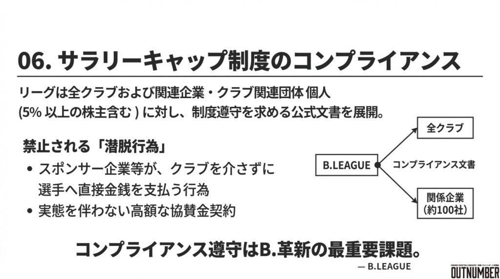 この取り組みの目的は、クラブ自身のルールを遵守だけでなく、関連企業などが意図せず潜脱行為に関与してしまう事態を防ぎ、クラブが責任をもって監督・指導する体制を構築することにあるとした。この文書は、Bリーグが指定する106の団体・個人(5%以上の株主含む)などにも展開済みであり、クラブにはその結果報告も求めている。Bリーグは制度遵守に対して極めて厳正な姿勢で臨んでいるとした。