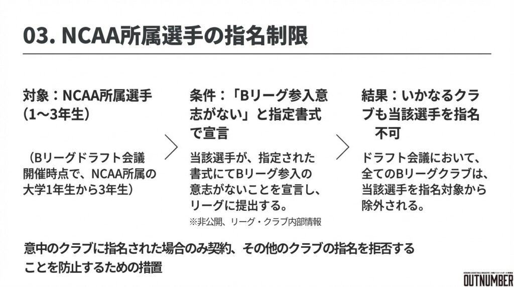 NCAAに所属する1~3年生の選手が、ドラフト前の事前交渉で翌季のBリーグ参入の意思がない事を明言した場合、指定の書式でBリーグに対し「翌シーズンにBリーグへ参入する意思がない」ことを宣言、いかなるクラブもその選手をドラフトで指名できなくなる。