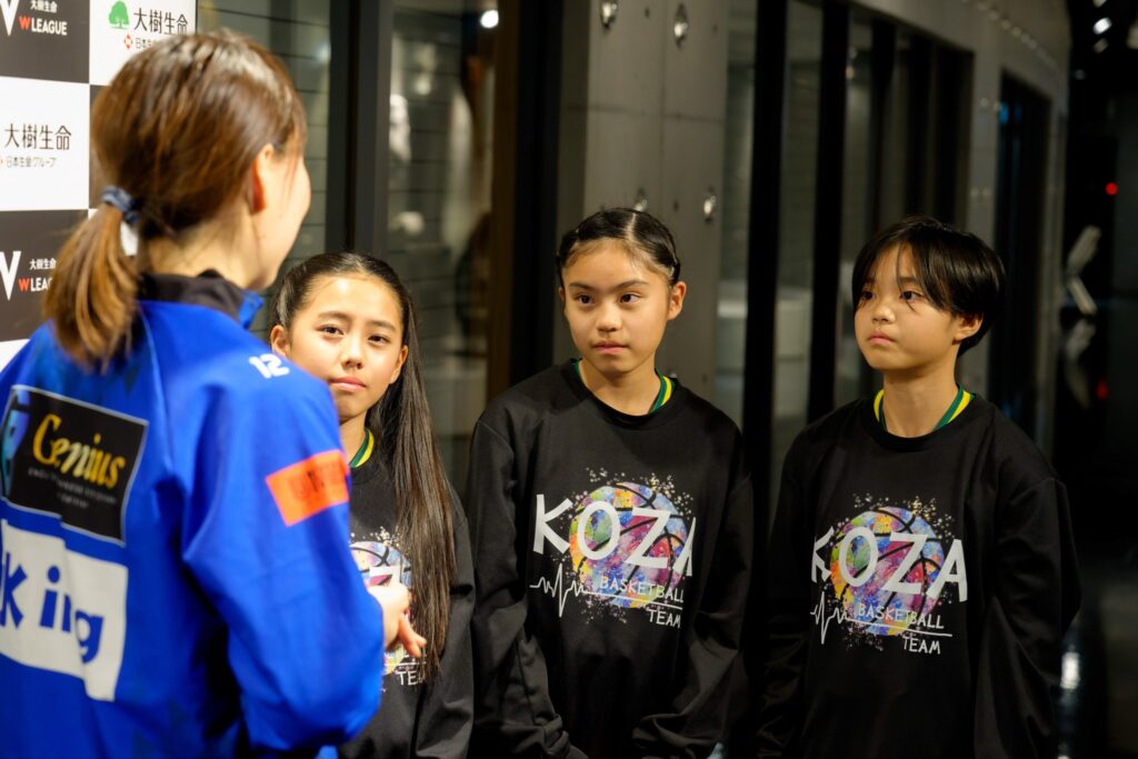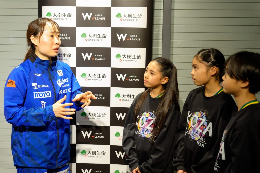 試合後の対面シーンでは、子供たちが「緊張して、コートに出るまで震えていました」とはにかみながら語ると、本橋選手は「あんな大勢の前で、なかなかないもんね。でもナイスパスでした。みんなの思いを持って戦ってきました」と優しく労いました。