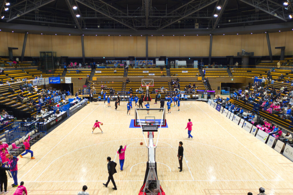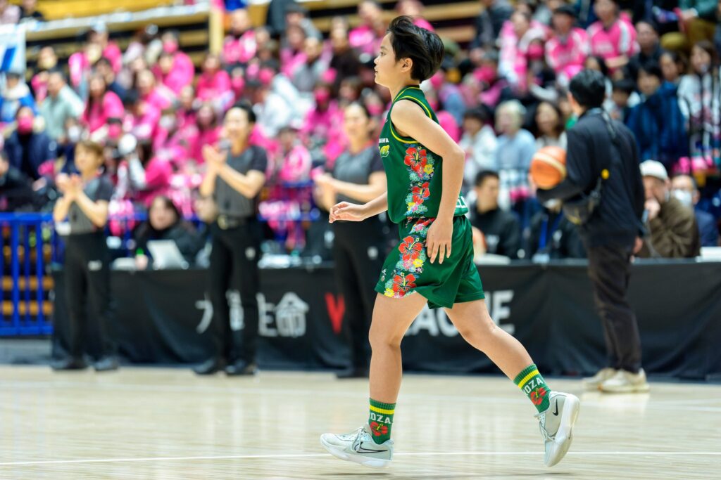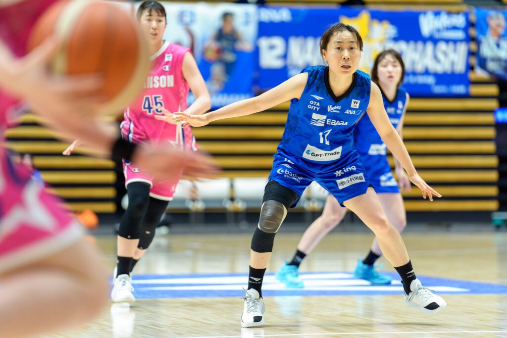 そしていよいよ試合が始まりました。この日の試合は、本橋選手が所属する東京羽田ヴィッキーズ 対 シャンソン化粧品。試合序盤はアウェーのシャンソン化粧品がリードを奪うも、ホームのヴィッキーズもファンの声援を受けて反撃を開始。点差を離されても諦める姿勢は全く見せず、チーム全員が一丸となってディフェンスを頑張り、じわりじわりと点差を詰めていきます。