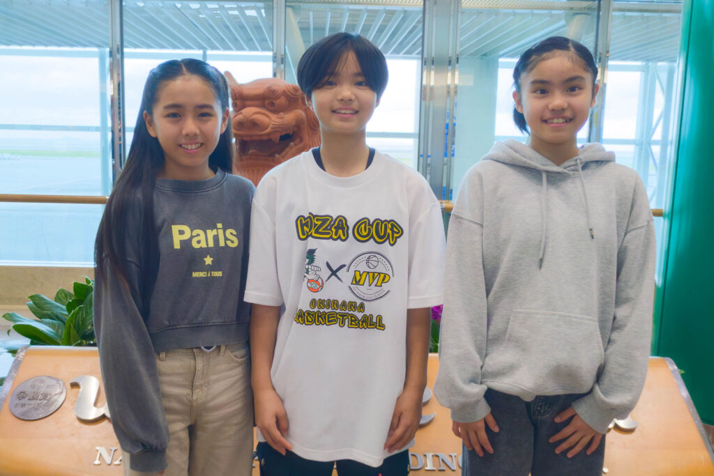 今回「NAKOプロジェクト」で東京へ向かったのは、沖縄市立コザ小学校6年生の屋冨祖 奈々(やふそ なな)さん、山川 和海(やまかわ なみ)さん、沖縄市立宮里小学校6年生の金城 希乃(きんじょう のの)さん。3人ともコザ小学校ミニバスケットボール部のチームメイトで、昨年の6月に沖縄で行われた本橋選手バスケットボールクリニックに参加しました。