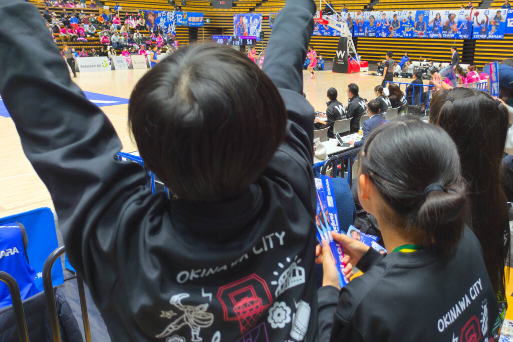 今回は本橋選手が実際にプレーする姿を見る機会です。本橋選手と同じポイントガードを目指しているという奈々さんは「オフェンスのドリブルをどんな風に突いているのか盗みたいです!」と元気に話してくれました。3人とも緊張する様子もなく、笑顔で那覇空港を出発しました。でも、大人たちは「そんなに薄着で大丈夫かな…」とちょっと心配(笑)