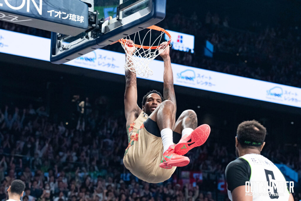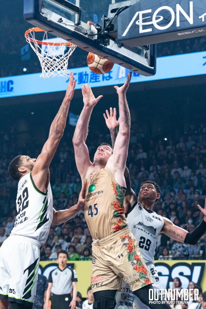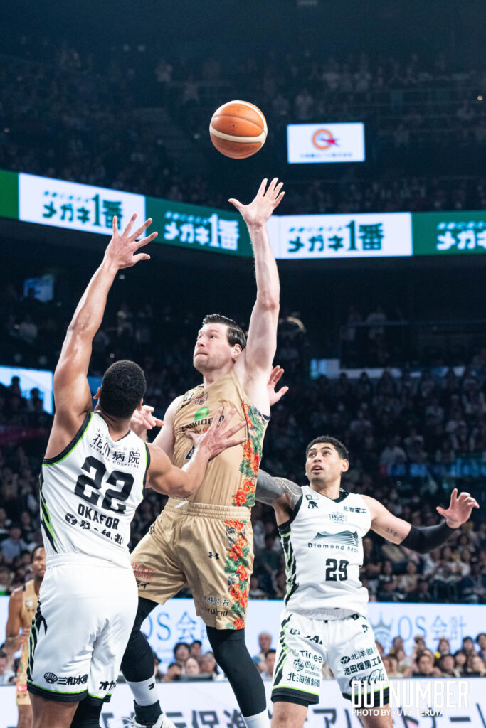北海道の攻撃起点である#22 ジャリル・オカフォーをわずか10得点に抑え込んだ。キングスはローポストにボールが入る瞬間に徹底的なダブルチームを仕掛け、適切なディフェンスローテーションで、オカフォーの得点とパス供給の双方を封殺した。