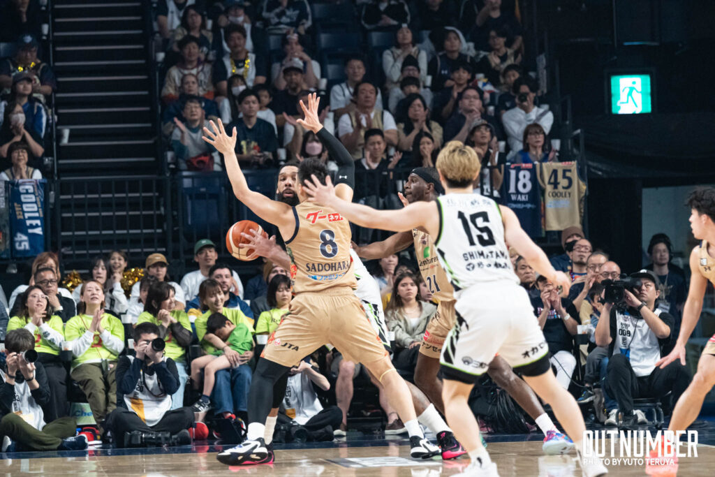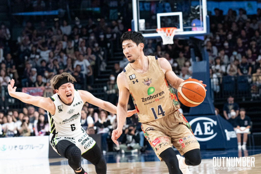2Qに入ると、キングスの組織的なディフェンスがさらに機能し始める。北海道の強力なインサイドの起点である#22 ジャリル・オカフォーに対して、キングスは早いタイミングでダブルチームを仕掛け、ローテーションをきっちりと遂行した。オカフォーに自由を与えず、北海道のオフェンスを停滞させた。攻撃では岸本が安定したパフォーマンスを見せ、前半だけで13得点をマークした。44-30と、キングスが14点のリードを奪って試合を折り返した。