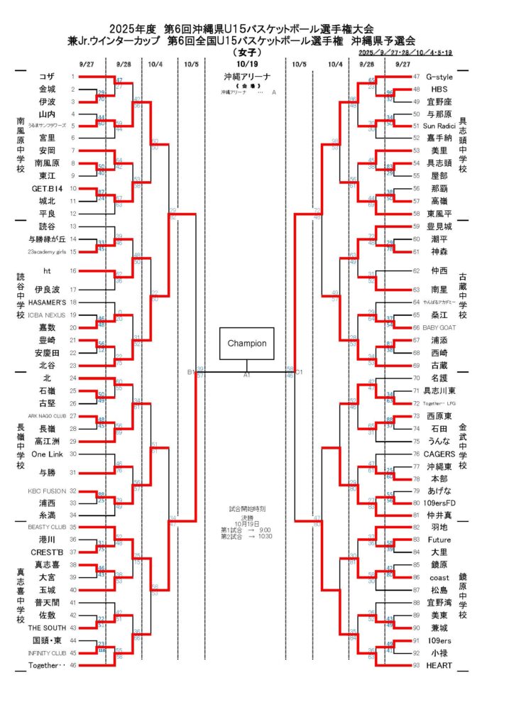 10月5日(日)、2025年度 第6回沖縄県U15バスケットボール選手権大会(兼Jr.ウインターカップ 第6回全国U15バスケットボール選手権 沖縄県予選会)が宜野座アリーナ(宜野座村総合体育館)で行われ、BEASTY CLUB、G-styleがそれぞれ勝利。10月19日に沖縄サントリーアリーナで開催される「第5回 沖縄アリーナカップ」へ進出が決定した。