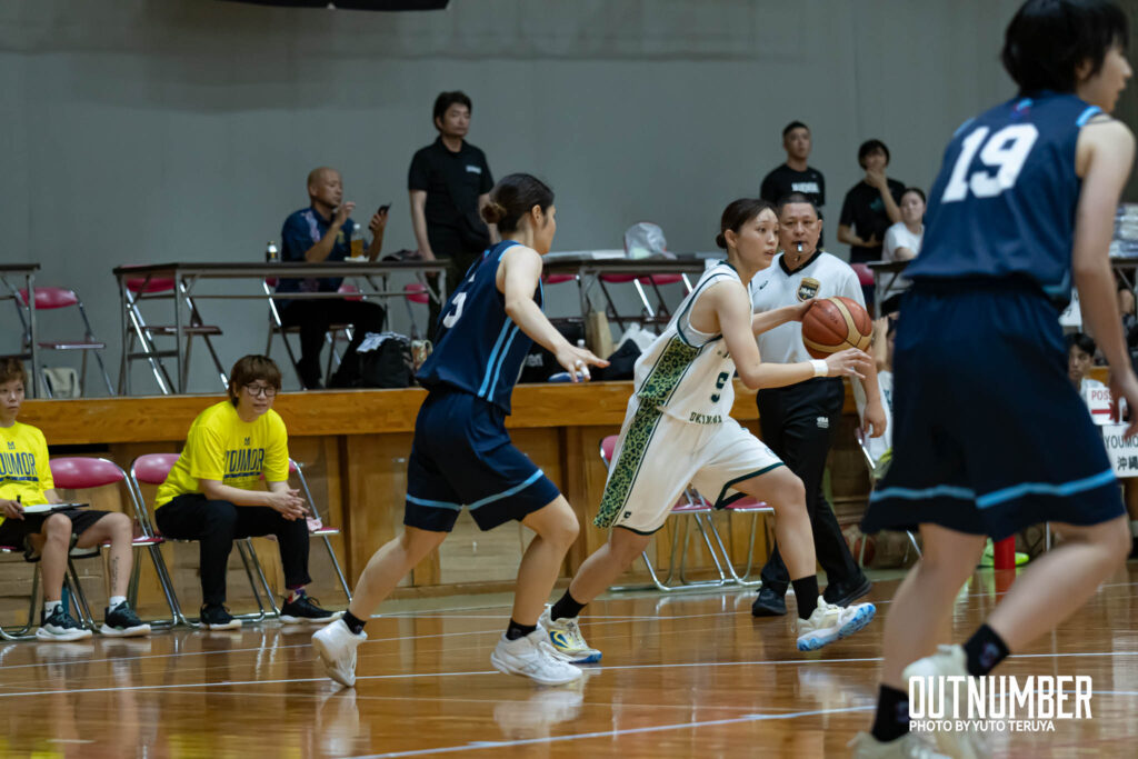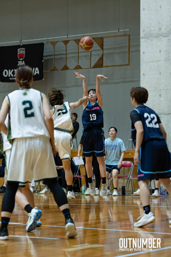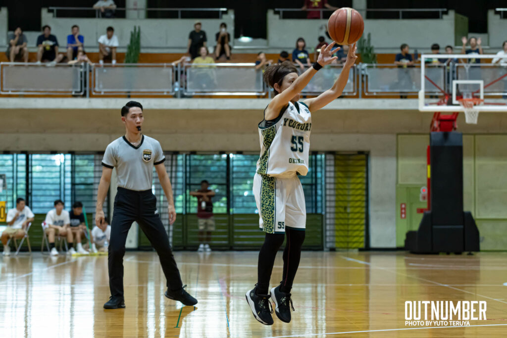 2クォーターに入ると、YOUMORE沖縄は素早いボールムーブから3ポイントを連続で沈める。