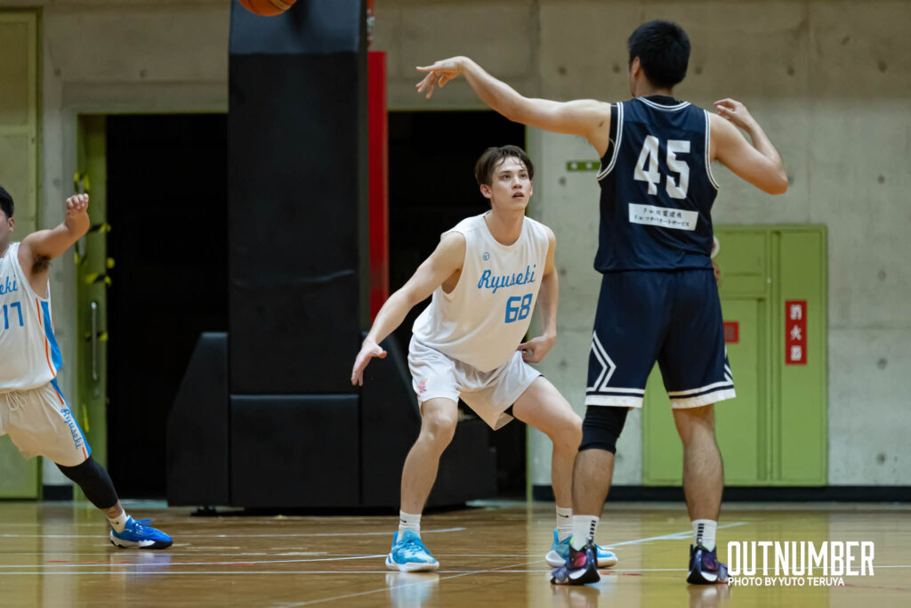 2クォーターには、りゅうせきクラブの#68 田村がこのクォーターだけで2本の3ポイントを含む8得点を上げるが、43-47と双葉建機がリードして前半を終える。