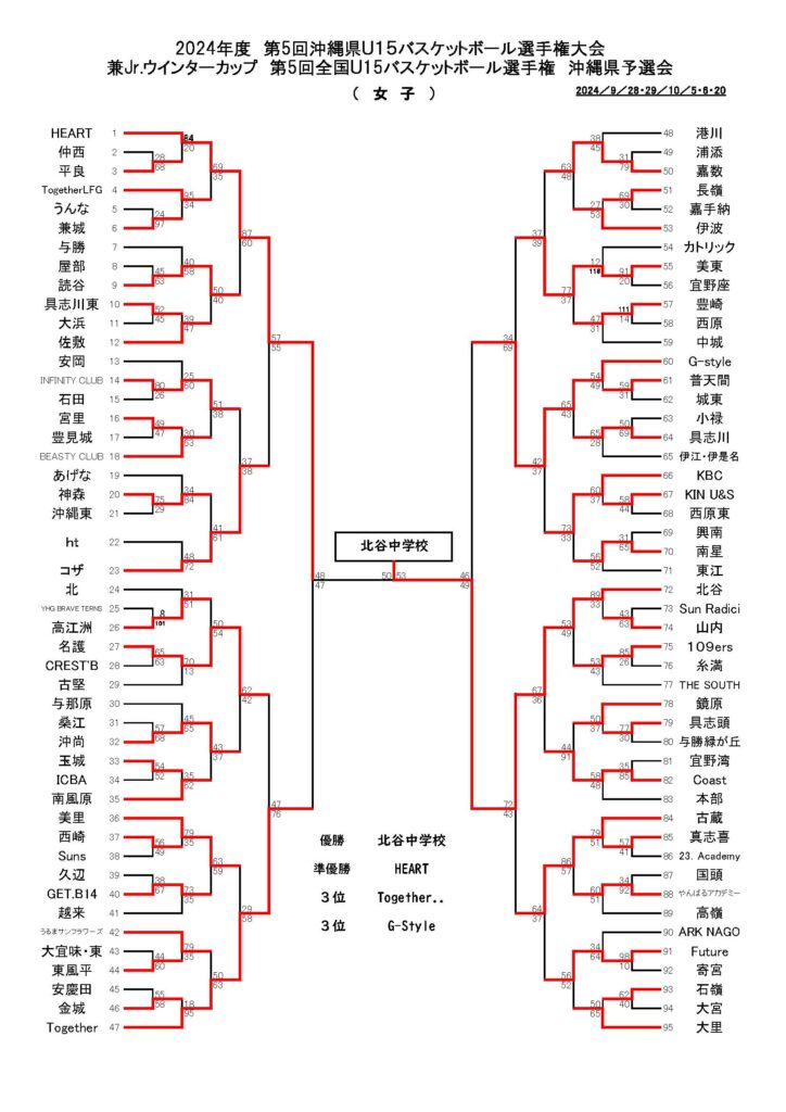 沖縄アリーナカップU15女子決勝(2024年度沖縄県U15バスケットボール選手権大会 兼Jr.ウインターカップ沖縄県予選決勝)は、南城市を拠点とするクラブチーム「HEART」と、北谷町立北谷中学校の対戦となり、50-53で北谷中学校が勝利した。