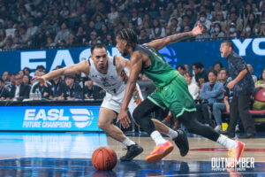 脇は京都の日本人エース岡田 侑大をマークし、岡田の強みである1対1の場面でギャップを作らせずにディフェンスで食らいつく。脇のグッディ(グッドディフェンス)に反応した沖縄アリーナの観客は、脇を後押しするように歓声をおくった。