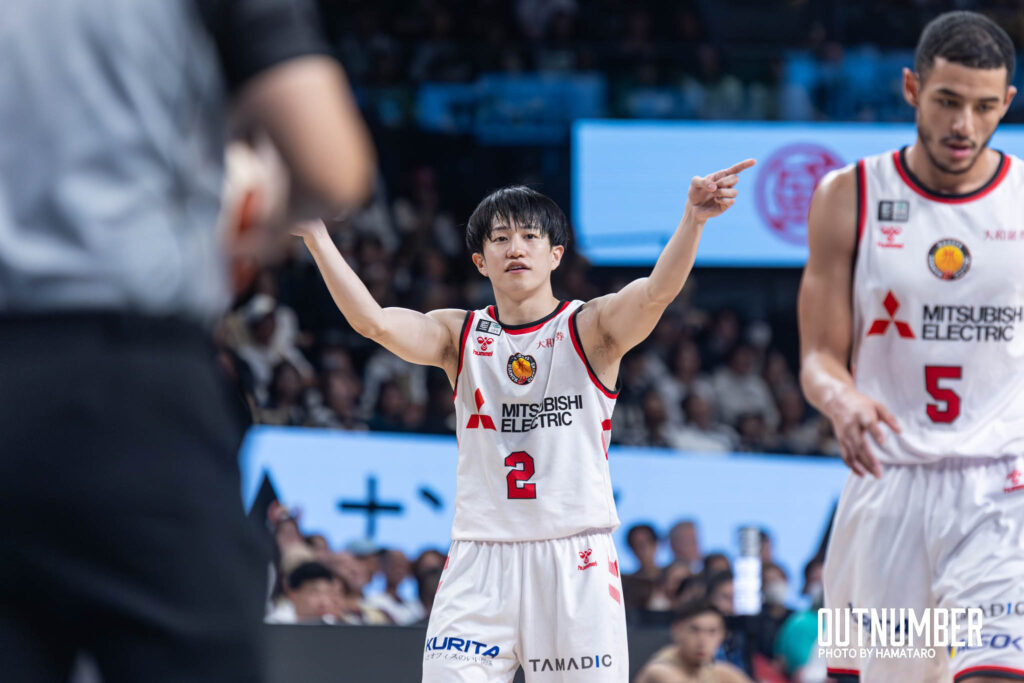 #2 齋藤拓実: チームの司令塔としてオフェンスを完璧に指揮。13得点に加え、ゲームハイの8アシストを記録し、味方の得点チャンスを次々と創出。彼のゲームメイクが、名古屋Dのスムーズな攻撃のリズムを生み出した。